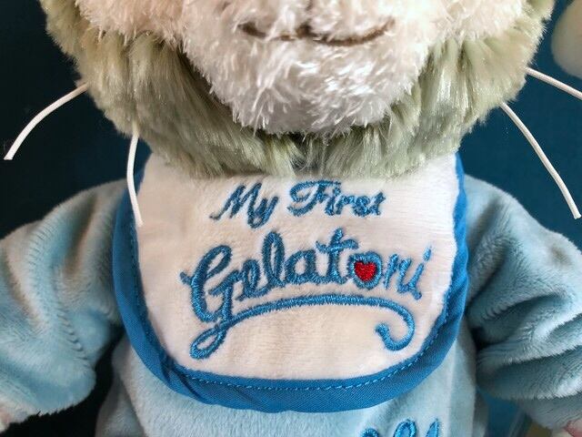 落ち着いた水色のベビー服には足裏のマーク、よだれかけにはマイファーストジェラトーニのロゴが刺繍されています。