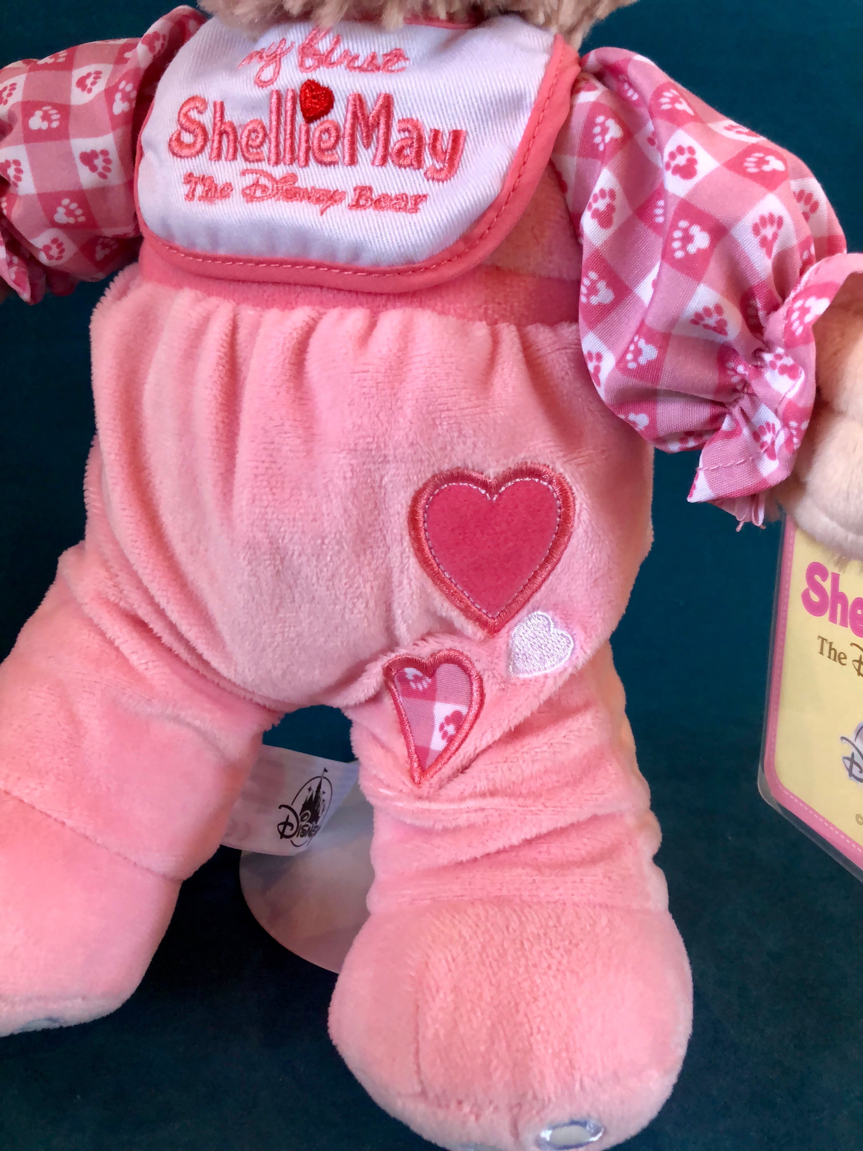 可愛いピンクのベビー服には♡のマーク、よだれかけにはマイファーストシェリーメイのロゴが刺繍されています。