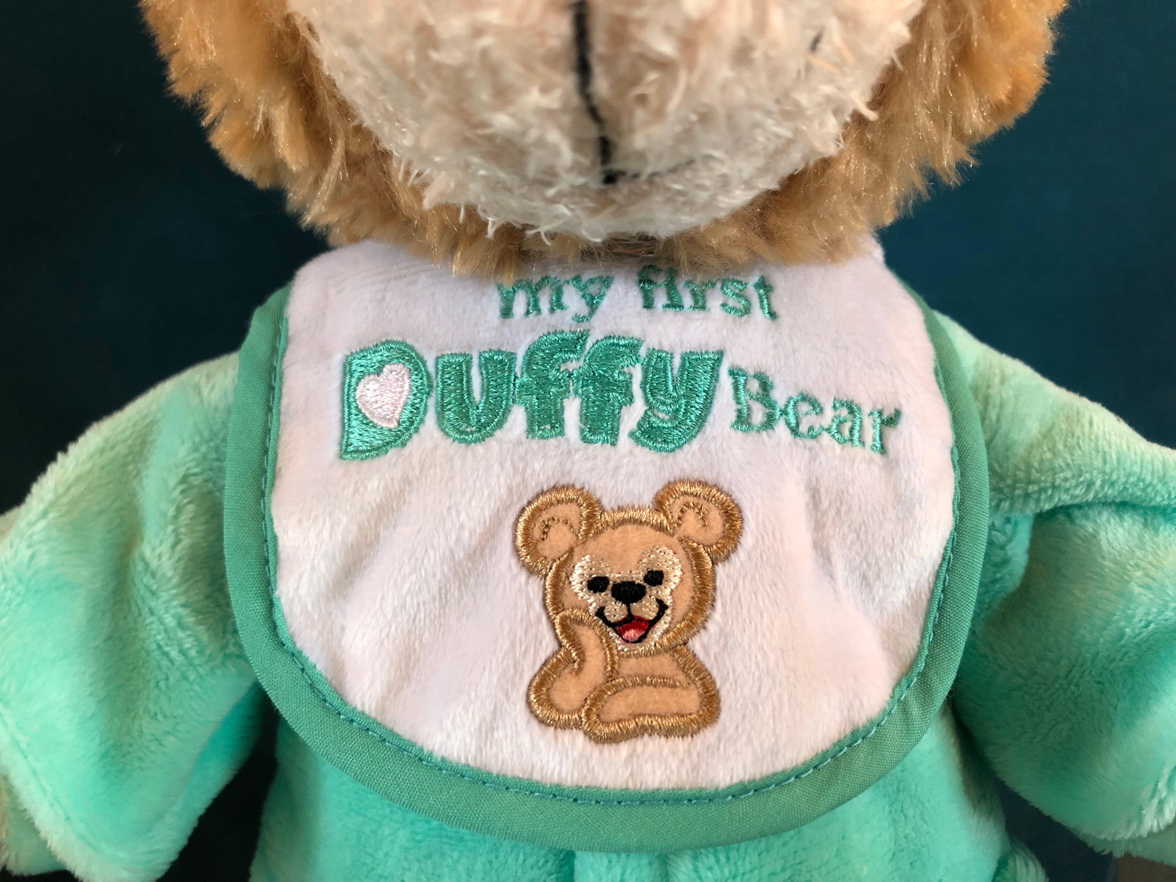 綺麗な淡いグリーンのベビー服にはDBのイニシャル、よだれかけにはマイファーストダッフィーのロゴとイラストが刺繍されています。